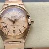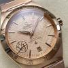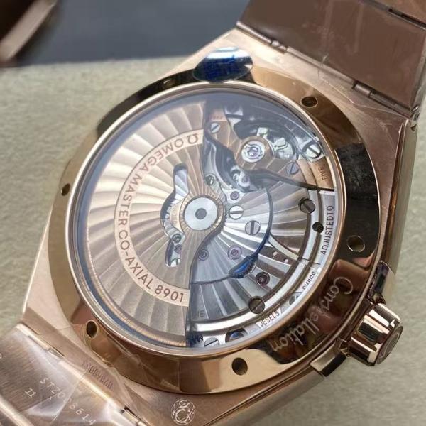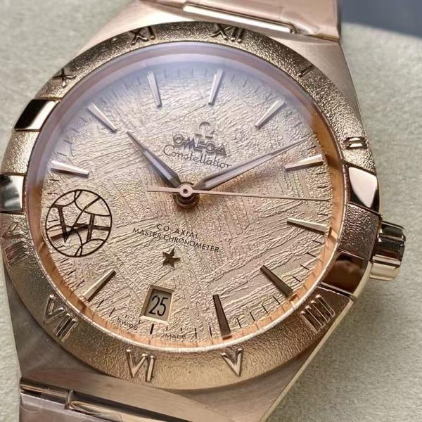 Series Affiliation: Omega's classic Constellation series, with the iconic "claws" design (metal claws on the bezel) being a defining feature of the series; Special Design: The bezel features Roman numeral markers with a brushed finish, and the dial is decorated with a textured finish (similar to "meteorite" or "crack" patterns), complemented by the Constellation series' signature "star" logo; Highlights: Powered by the Omega Co-Axial Master Chronometer movement, boasting antimagnetic properties and high accuracy (0-5 seconds per day), the case is crafted from rose gold, placing it among the high-end luxury models.