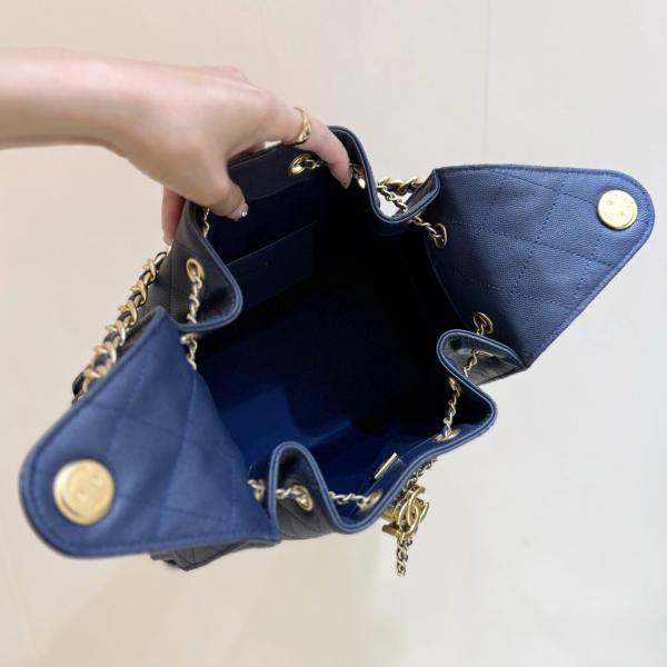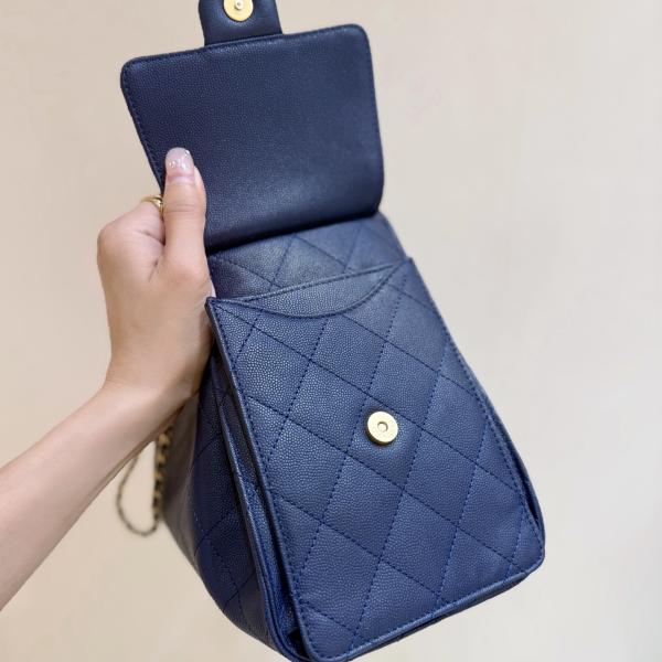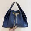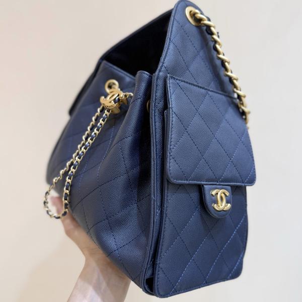 Crafted from deep blue quilted pebbled leather, this bag features the iconic gold double-C metal clasp and a metal chain (leather threaded with the chain). Its bucket-shaped silhouette includes an adjustable chain shoulder strap, allowing for multiple carrying options: hand-carry, shoulder bag, or crossbody. It combines a relaxed, vintage feel with brand recognition.