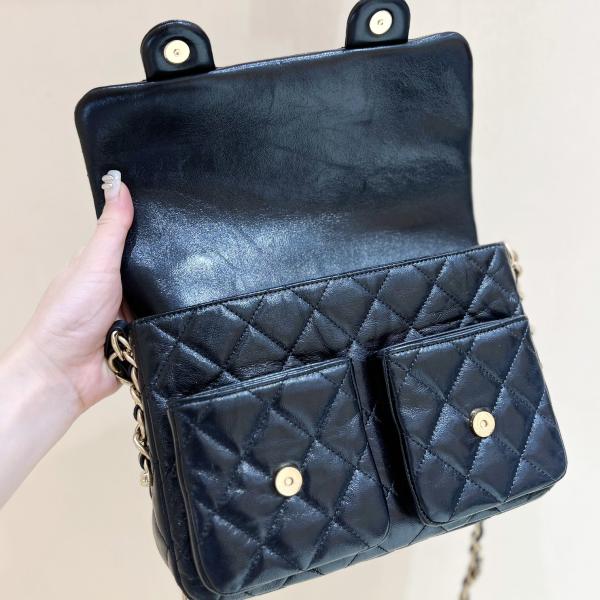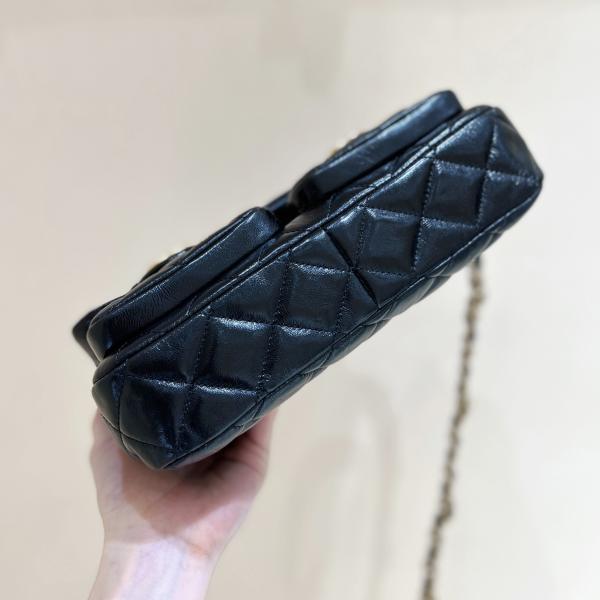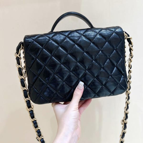 Crafted from black quilted lambskin, this bag features the iconic gold double-C metal buckle and a chunky chain shoulder strap (incorporating brand logo details within the chain). The classic flap bag silhouette is now available with a new short handle, allowing for multiple carrying options: hand-carry, shoulder-carry, or crossbody. It combines vintage luxury with everyday practicality.