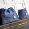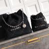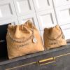 Crafted from light brown suede with a quilted texture, this bag features the iconic metal chain shoulder strap (with leather threaded chain) and a drawstring closure. The bag is embossed with the "CHANEL" logo and includes a round brand tag. It can be worn over the shoulder or crossbody, offering a relaxed and effortless style.