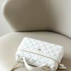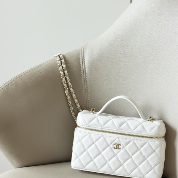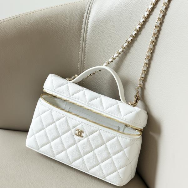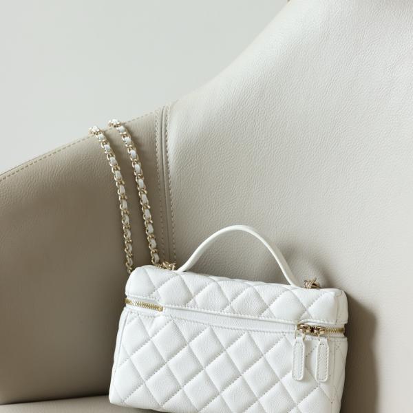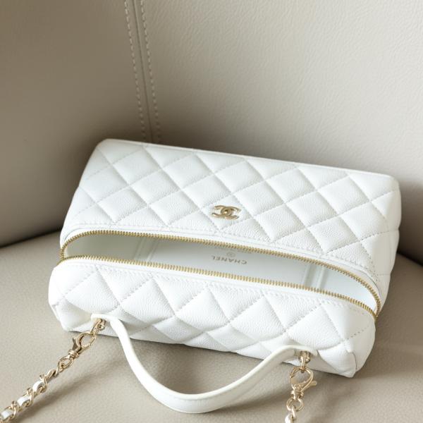 Crafted from white quilted pebbled leather, this bag features a gold double-C logo and a metal zipper. It comes with a short leather handle and a leather chain shoulder strap, allowing for multiple carrying options: hand-carry, shoulder bag, or crossbody. Its compact and elegant design makes it a versatile piece that combines both style and practicality.