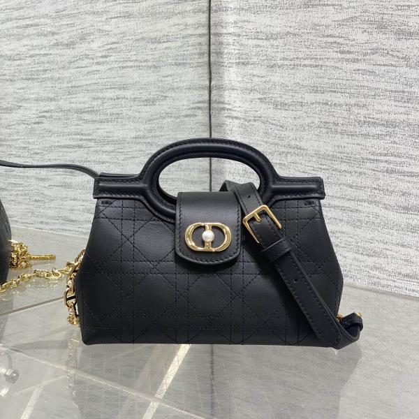 Crafted from black quilted lambskin and featuring the iconic gold CD clasp (with a pearl embellishment in the center), this mini handbag boasts a horizontal silhouette with a short handle and a detachable leather shoulder strap, allowing for multiple carrying options: hand-carry, shoulder-carry, or crossbody. It combines vintage elegance with everyday practicality.