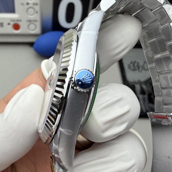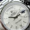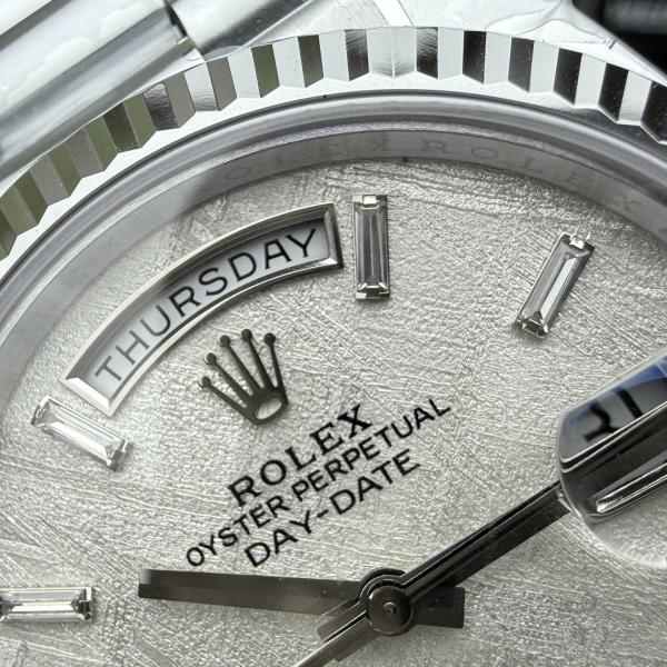 904L steel case with President bracelet, silver-white mother-of-pearl dial with 18K white gold Roman numeral hour markers, fluted bezel, powered by Calibre 3235 self-winding movement, 70-hour power reserve, water-resistant to 100 meters, date display function, classic fluted bezel design.