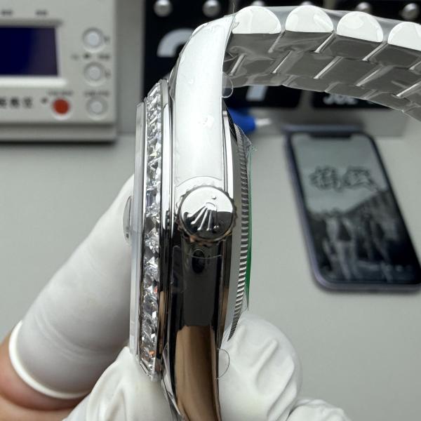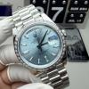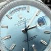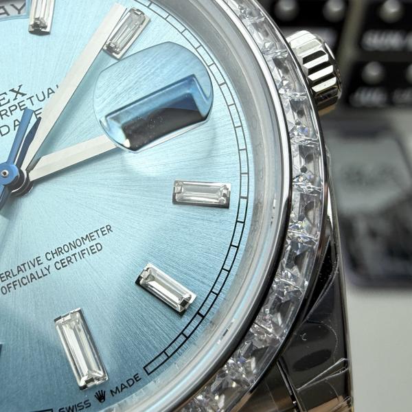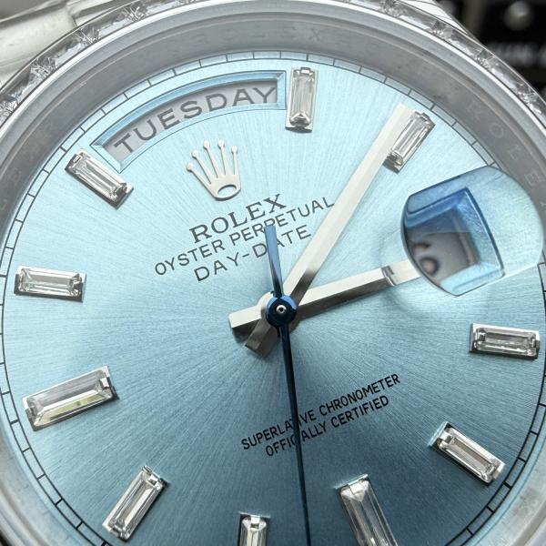 904L steel and 18K white gold case with President bracelet. Ice blue dial with baton hour markers. 18K white gold bezel set with diamonds. Powered by Calibre S255 automatic movement. Power reserve: 70 hours. Water resistance: 100 meters. Dual day and date display. Case diameter: approximately 36mm.