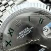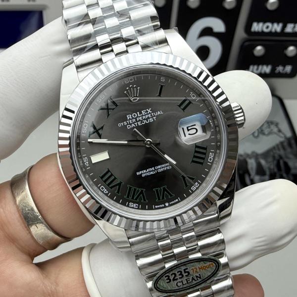 904L steel case with five-link bracelet, triangular fluted steel bezel, gray dial with Roman numeral hour markers, powered by Cal. 3235 automatic winding movement, 70-hour power reserve, water-resistant to 100 meters, date display with magnifier, Easylink adjustable link system.