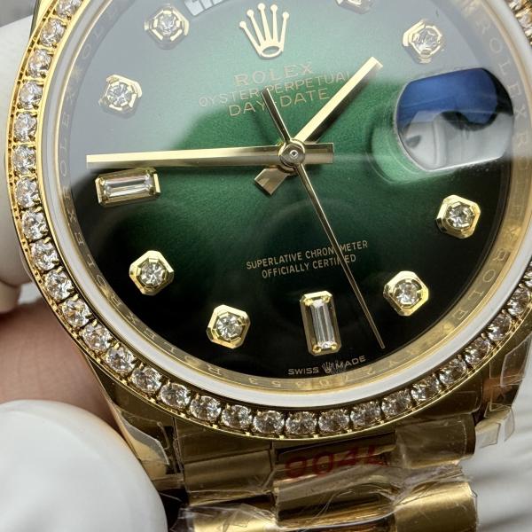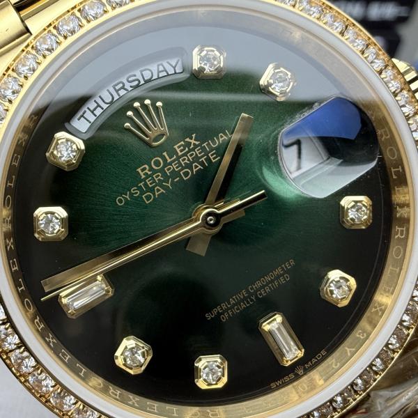 18K yellow gold case with President bracelet, green enamel dial with diamond hour markers, 18K yellow gold diamond-set bezel, powered by Calibre 3255 self-winding movement, 70-hour power reserve, water-resistant to 100 meters, dual day and date display, exclusive presidential watch design.