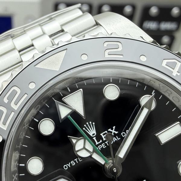 904L钢表壳与五珠链表带,绿色Cerachrom陶瓷24小时刻度双向旋转表圈,黑色表盘配Chromalight夜光时标,搭载Cal.3285自动上链机芯,动力储存70小时,防水100米,两地时区显示功能。